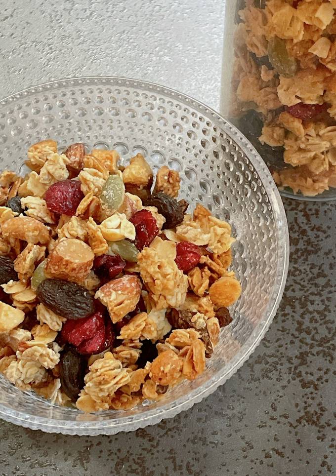 小腹が空いたときにちょこっと摘める、ごろごろしたグラノーラ。もちろん牛乳やヨーグルトをかけても◎
