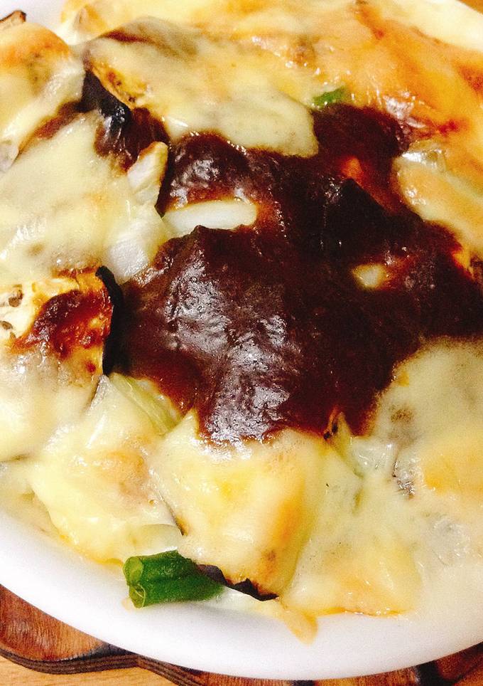 ご飯の上にホワイトソースをかけ、その上に野菜、カレーソース、最後にスライスチーズを適当にちぎる。
