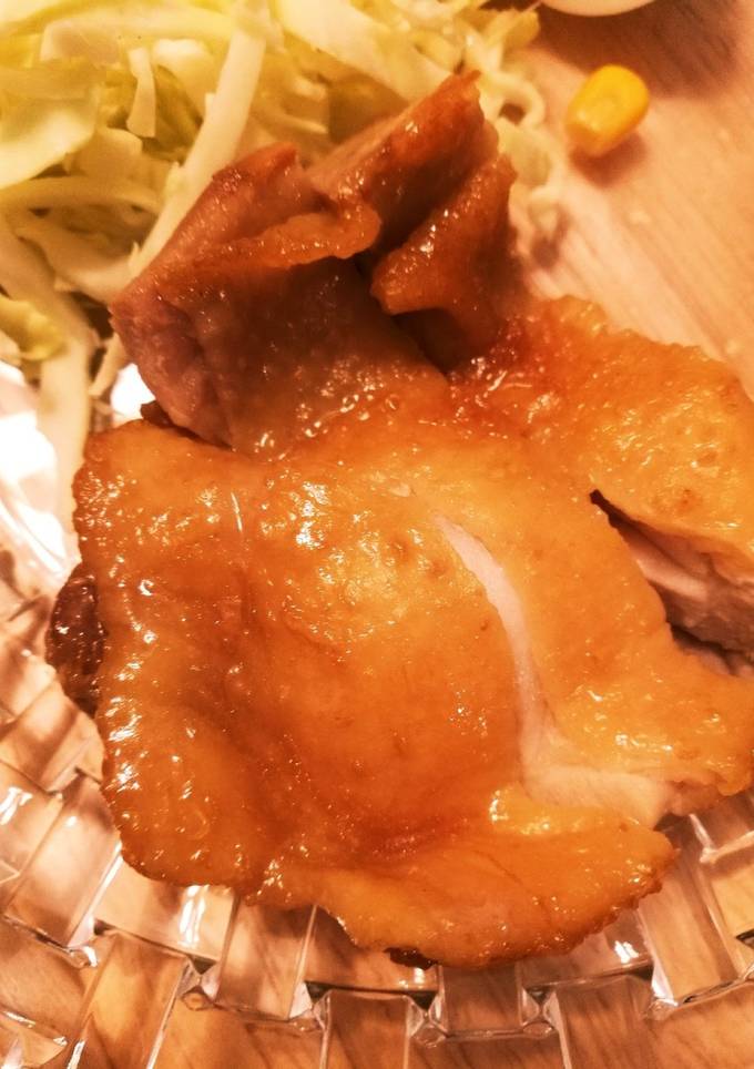 鶏もも肉の皮に片栗粉をまぶす。熱したフライパンで皮からこんがり焼いて、ひっくり返して軽く焼く。